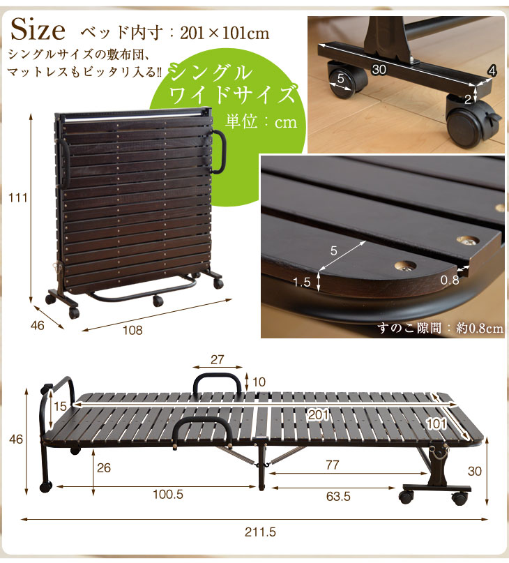 ▼ぴったりな敷き布団はこちら▼ ▼こちらのベッドもおすすめです!▼ コンセント2口付宮付き折りたたみベッド 仕様 サイズ ベッド外寸:幅108×奥行211.5×高さ46cm ベッド内寸:幅101×奥行201cm 折り畳み時外寸:幅108×奥行46×高さ111cm すのこ板1枚:幅5×長さ101×厚み1.5cm 床から床板まで30cm 床板下から床まで26cm 【スタッフしょこたんのおすすめポイント!】 ・敷布団もピッタリ入る! ・すのこぎっしり33枚 ・寝心地アップ!隙間0.8cm ・湿気に強い天然桐 ・部屋を広く使える折りたたみ式 ・お子様にも安心の低ホルムアルデヒド仕様 ・安心の耐荷重約180kg ・安全ストッパー付き ・傷がつきにくいPUキャスター 通気性抜群の桐すのこベッド。