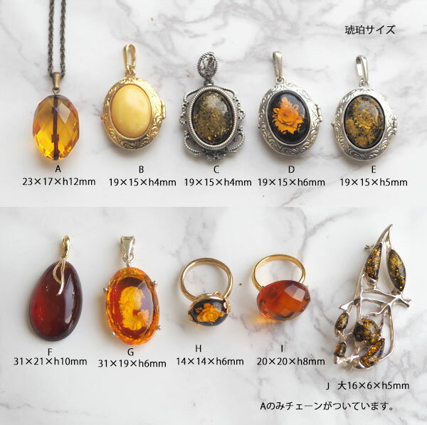 琥珀は天然宝石のため植物の欠片などの黒い点、天然のわれ、かけが含まれております。