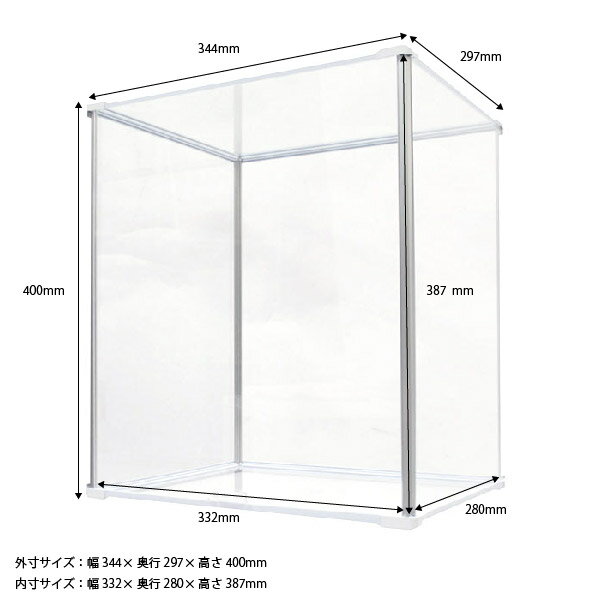 【商品仕様】 外寸サイズ:幅344×奥行297×高さ400mm 内寸サイズ:幅332×奥行280×高さ387mm 本体素材:アクリル、アルミ、ABS樹脂 製品重量:約2.5kg 耐荷重:500g 【生産国】 日本 【組み立て】 お客様組み立て品です。