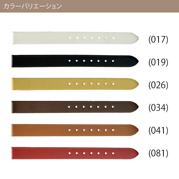 商品スペック カラー ホワイト White (017) ブラック Black (019)) ベージュ Beige (026) ダークブラウン Dark Brown (034) ゴールドブラウン Gold Brown (041) バーガンディ Burgundy (081) 素材 カーフ(牛革) 長さ 【女性用サイズ】 剣先側105mm / 尾錠側70mm 厚さ 約2mm サイズ展開 【女性用サイズ】 E7mm-B6mm / E8mm-B8mm / E9mm-B8mm E10mm-B10mm / 11mm-10mm / E12mm-B12mm ※【E】は時計に装着する側の幅、【B】はバックルの幅です。