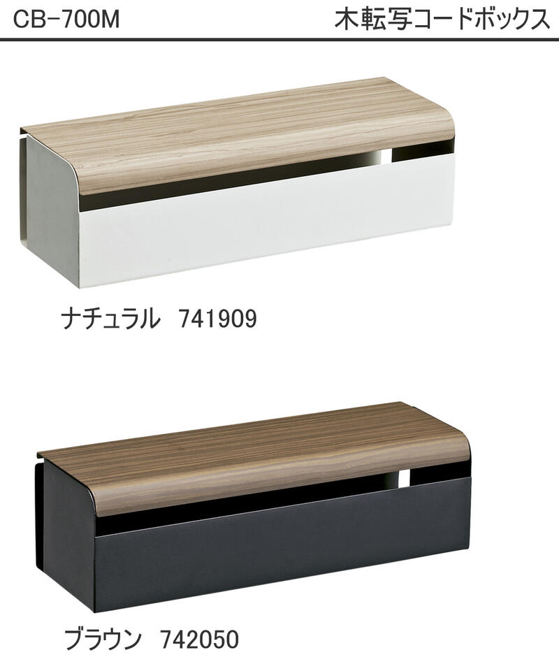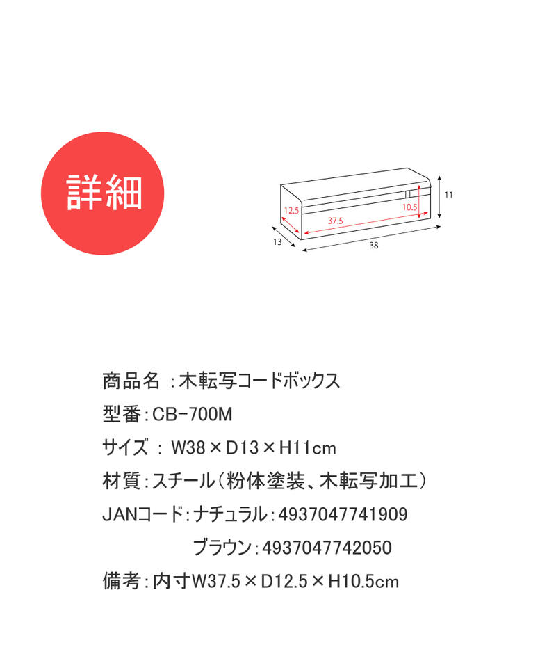 商品名:木転写コードボックス 型番:CB-700M 商品サイズ:W38×D13×H11cm 材質:スチール(粉体塗装、木転写加工) JANコード:ナチュラル:4937047741909 ブラウン:4937047742050 備考:内寸W37.5×D12.5×H10.5cm 商品名 木転写コードボックス 型番 CB-700M サイズ W38×D13×H11cm 材質 スチール(粉体塗装、木転写加工) JANコード ナチュラル:4937047741909 ブラウン:4937047742050 備考 内寸W37.5×D12.5×H10.5cm